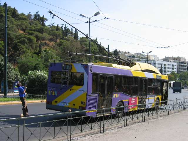 A diversion here--just across Konstantinou Street from the stadium, this Athens city trolley bus drove by with a BANG! It was the sound of its overhead pickup arms losing contact with the catenary wires.