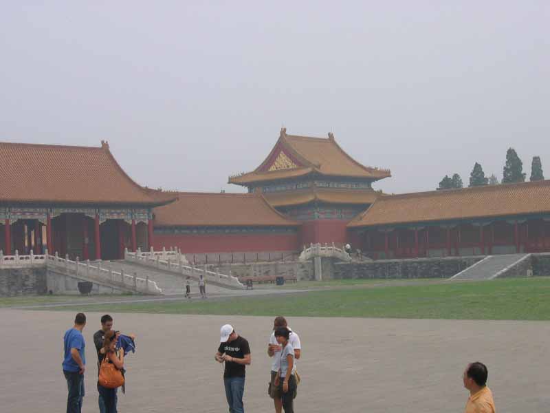 And a look back, before going through the Gate of Supreme Harmony, at the Meridian Gate, beyond the five bridges.
