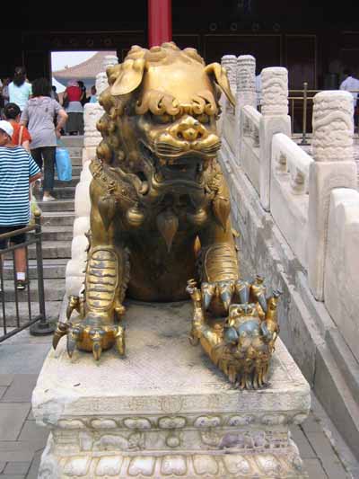 Beyond the Baohe dian, of Hall of Preserving Harmony, is another courtyard, and the Gate of Heavenly Purity, leading to the Inner Court. So far, we've been in the Outer Court. Standing guard leading up to the gate are these two bronze lions. (BTW, there are no real lions in China) Can you tell which lion is the male, and which is the female?