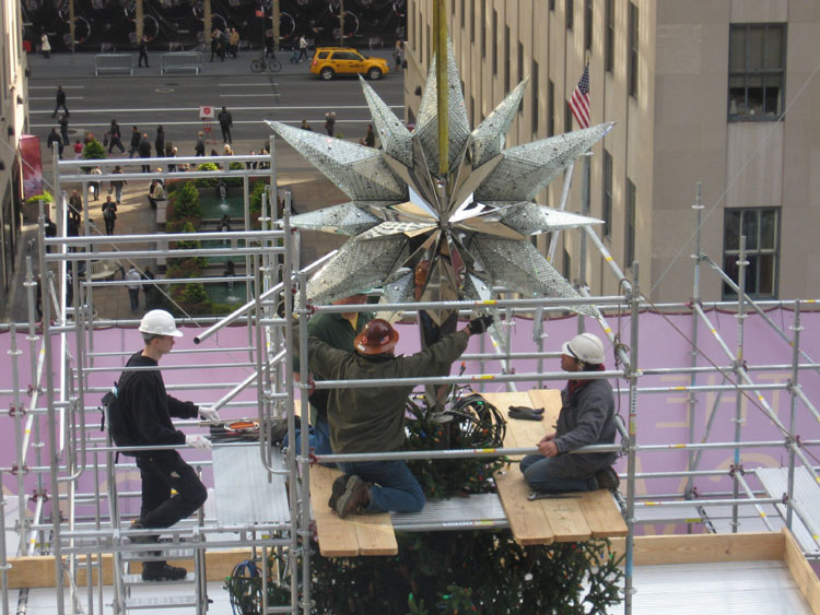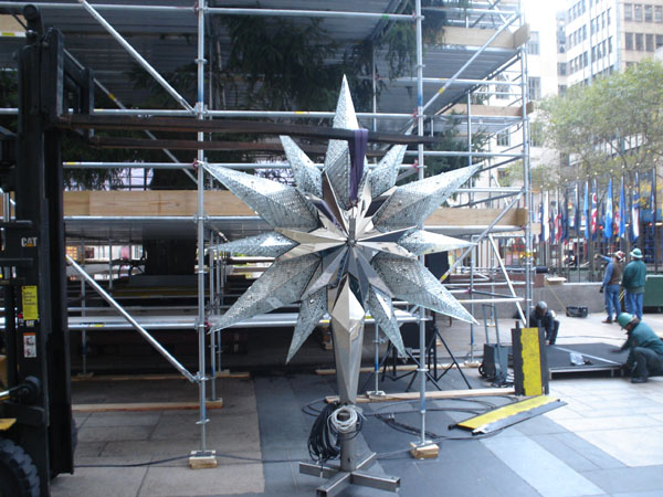 Now it's Thursday 11/18, the day they'll hoist the Swarovski star to the top of the tree. Here, it's on the ground, being held up by a forklift. A giant crane (just out of the picture on the right) will hoist the star into position.