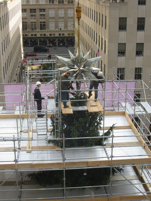 Seven stories above Rockefeller Plaza, the crane holds the star in place, as workmen secure it and rig the lighting. Keep in mind, the tree lighting is still 12 days away, so there's much more work to be done behind the scenes.