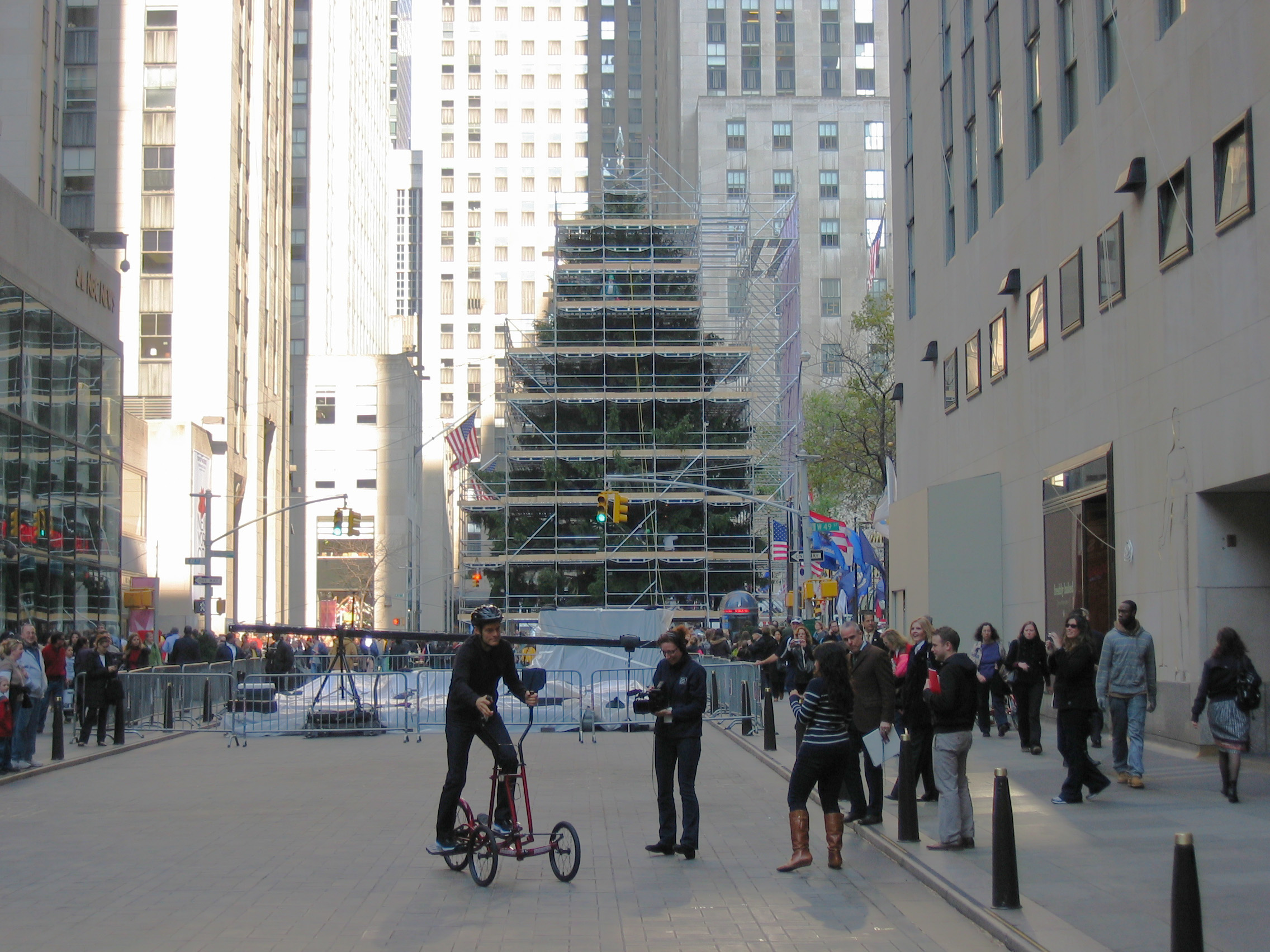 Here's the tree on Monday November 22, from 48th Street. Who's the doofus on the hi-tech tricycle? If you said Dr. Oz, you'd be right! Click on the image to get a larger, higher resolution picture.