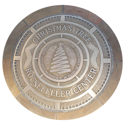 The tree sits on top of this manhole cover-sized plaque, which is set into the Rockefeller Center sidewalk. This picture was taken on 11/11/10, just minutes before crews started staging the area for the tree's arrival the next day.