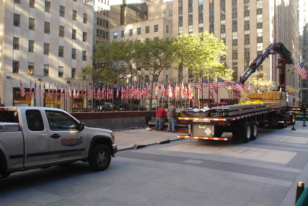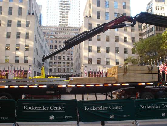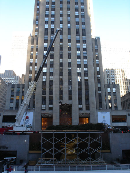 The tree arrived by truck on November 12. It's laying on it's side, below. The golden statue of Prometheus has been obscured in this view by the scaffolding platform.