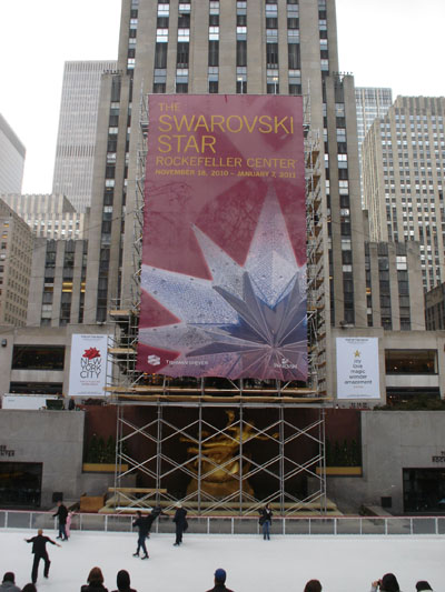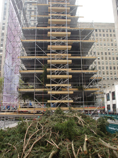 Above, a couple of pictures from Monday November 14. At left, a banner hangs down over one side of the tree. At right, the view from 50th St., revealing some of the scaffolding that's been put up to trim the tree.