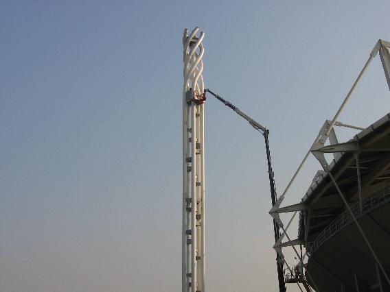 A close-up look at the structure that will support the Olympic flame, still being worked on.