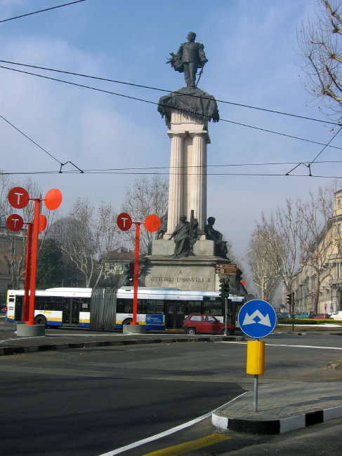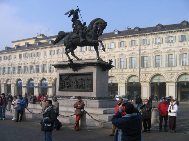 The bronze statue is of Duke Emanuele Filiberto of Savoy, victor in the 1557 Battle of San Quintino, and dates from 1833.